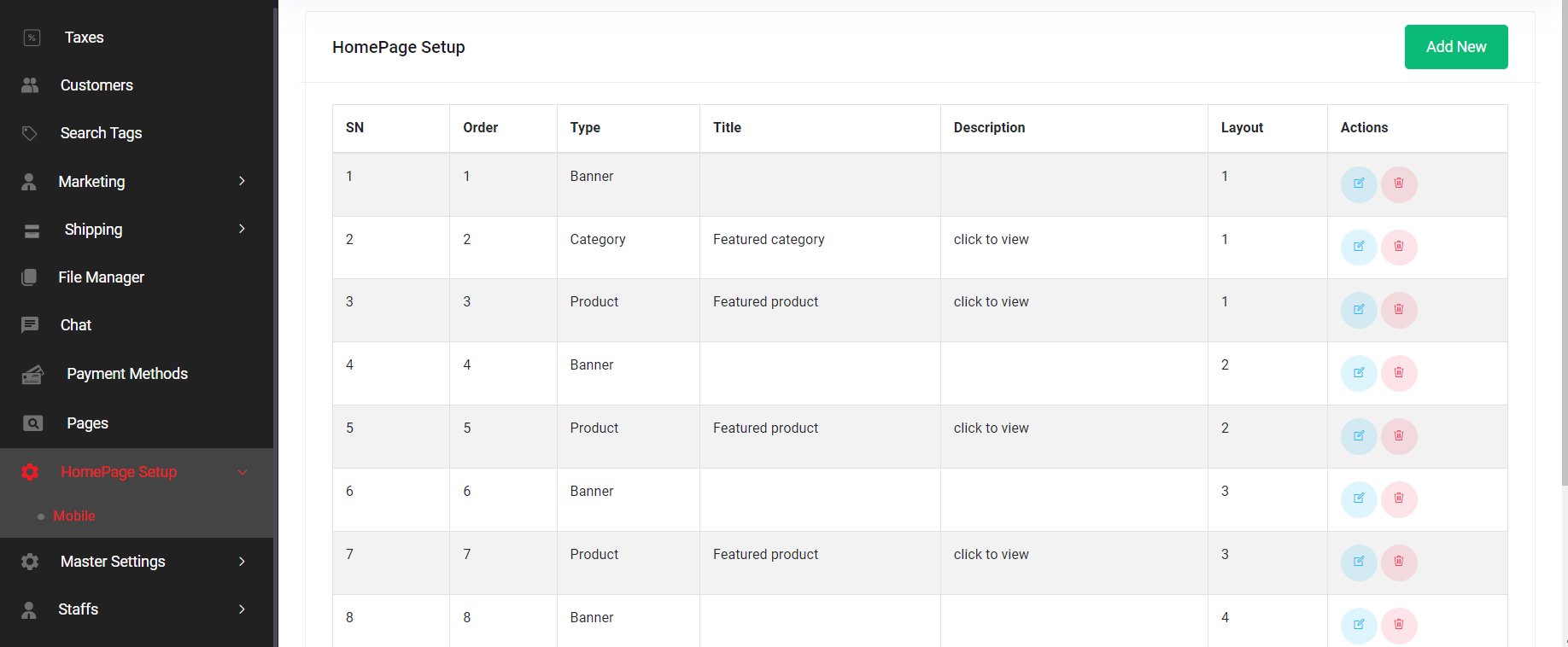 * **9.1.1 Add New**: Administrators can introduce new sections to the mobile homepage layout, customizing the appearance to cater to specific country-based preferences.